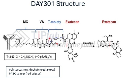 DAY301:2024年从麦科思生物(MabCare)许可获得。DAY301一种靶向 PTK7 (蛋白酪氨酸激酶 7)的 ADC,由一种人源化抗 PTK7 IgG1 mAb与拓扑异构酶 I 抑制剂exatecan mesylate通过高度稳定且具有亲水修饰(聚肌氨酸pSAR)的缬氨酸-丙氨酸(VA)可裂解连接子偶联而成(DAR 8),旨在用于治疗晚期实体瘤患者,目前正处于临床I期。