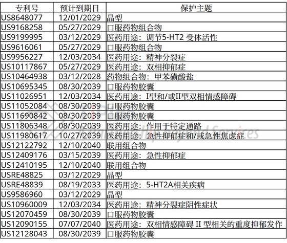Lumateperone的化合物结构式专利已经到期,根据橙皮书上登记的专利,围绕lumateperone的外围专利保护涵盖晶型、药物组合物、剂型和医药用途等主题,预计最晚到期日为2040年。目前已有多家仿制药企递交了ANDA申请并且Intra-Cellular已经针对仿制药企提起了多项诉讼。