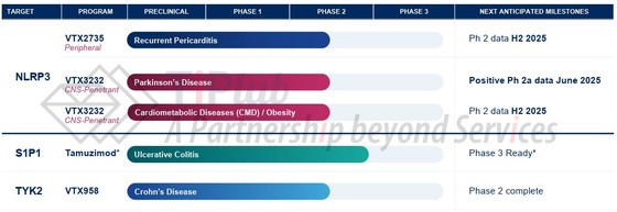 炎症性肠病产品组合包括 S1PR1 调节剂 tamuzimod 和 TYK2 抑制剂 VTX958,这两种药物均已完成 II 期临床试验。